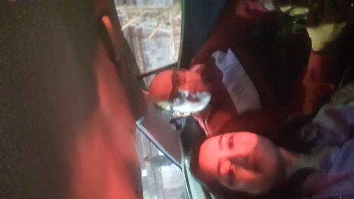 Inside a vehicle, a woman's face is illuminated by red light. She reclines near an orange hard hat with a light attached. Outside the vehicle window, bare tree branches and a gray sky are visible. The woman appears relaxed, possibly resting in the vehicle. Dark fabrics surround her, creating a shadowed background.