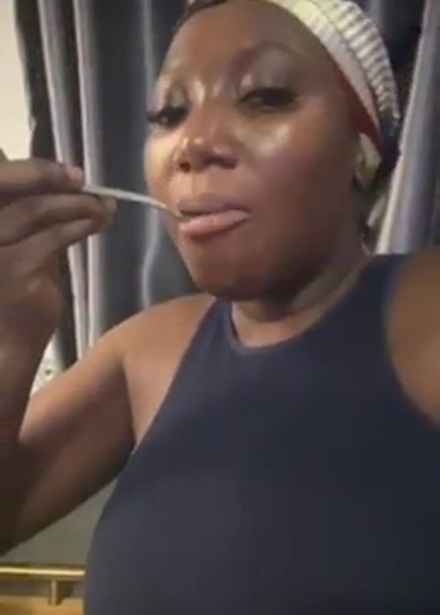 A medium shot shows a woman in a navy blue tank top and a patterned head wrap. She is indoors with gray curtains in the background. She sticks out her tongue toward a spoon filled with yellow food, eats the food, and then looks directly at the camera.