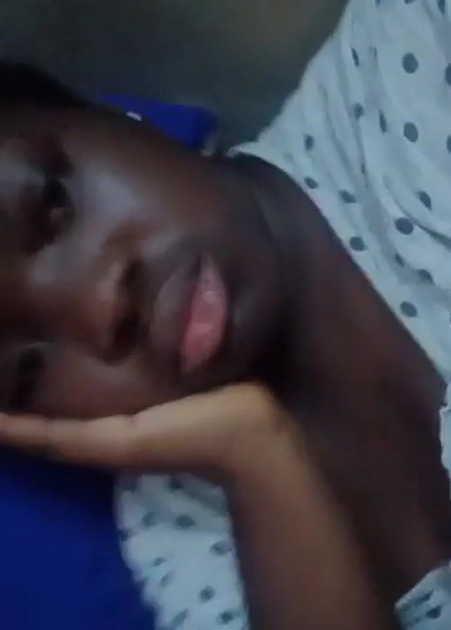 A young woman is lying on a blue pillow. She is wearing a light-colored shirt with dark blue polka dots. The pillow has a large orange heart shape on it. The woman is resting her head on her left hand and looking directly at the camera. Her expression appears somewhat tired or bored. The background is a simple wall.