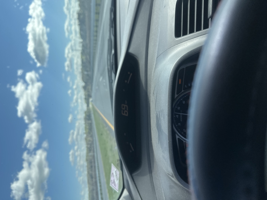 This image, captured from the driver's perspective inside a vehicle, depicts a multi-lane highway under clear blue skies with scattered white cumulus clouds. The vehicle is in motion, with the digital speedometer on the upper dashboard displaying "69", indicating a speed of 69 miles per hour. The lower dashboard shows a tachometer with a needle resting between 1000 and 2000 RPM, and an illuminated red warning light on the right, consistent with a Tire Pressure Monitoring System (TPMS) alert. The dashboard surfaces appear dusty. A purple-hued sticker, possibly a permit or toll tag, is affixed to the lower left portion of the windshield. The external environment visible through the windshield shows a paved asphalt highway with a solid yellow line delineating the left edge of the travel lane. Green grassy areas and distant trees line both sides of the highway, with what may be a body of water or reflective surface visible beyond the median on the left. The scene is consistent with travel on a major highway, such as Interstate 75, in or near Gainesville, Florida, United States, during daylight hours. No individuals are visible in the frame.
