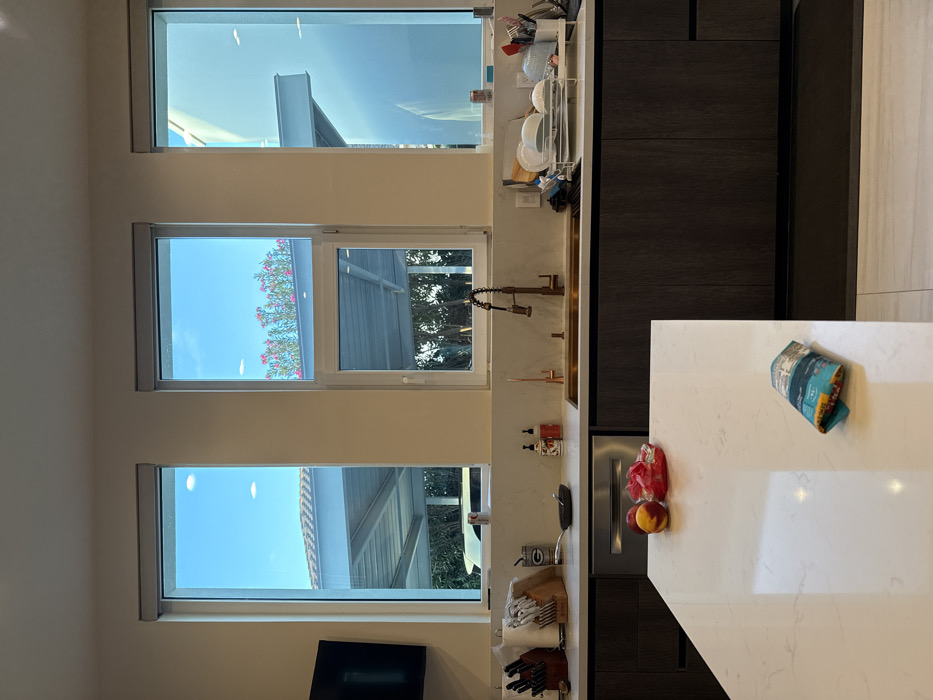 The image presents a modern kitchen interior located in McAllen, United States of America. The space is brightly lit by natural light entering through three tall, vertical windows and one smaller, horizontal window. The kitchen features white marble or quartz countertops and a large central island, complemented by dark wood-grain base cabinetry. A stainless steel dishwasher is integrated on the left side. Through the windows, a clear blue sky with minimal cloud cover is visible, along with multiple light-colored roof structures suggestive of carports or patio covers, green trees, and vibrant pink flowering plants. A portion of a white vehicle is discernible through the leftmost window, and a modern building structure with a prominent horizontal beam is seen through the rightmost window. On the countertops, a copper-toned faucet and sink are centrally positioned below the windows. To the right of the sink, a white dish drying rack holds white plates, bowls, and various kitchen utensils. To the left, a knife block, a small dark pan or bowl, two pump-style soap dispensers, a Green Bay Packers-branded item, and a metallic beverage can are arranged. On the foreground kitchen island, two peaches, a red mesh bag, and a folded, colorful fabric item are present. A dark flat-screen television is mounted on the far-left wall. No individuals are present in the scene.