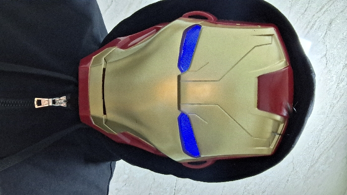 An Iron Man mask rests on a black hoodie. The mask is gold with red accents around the edges and blue lights on the sides. A zipper pull is visible on the left side of the hoodie. The background is light, likely a floor or surface. The mask is centrally positioned, with the hoodie filling the surrounding space.