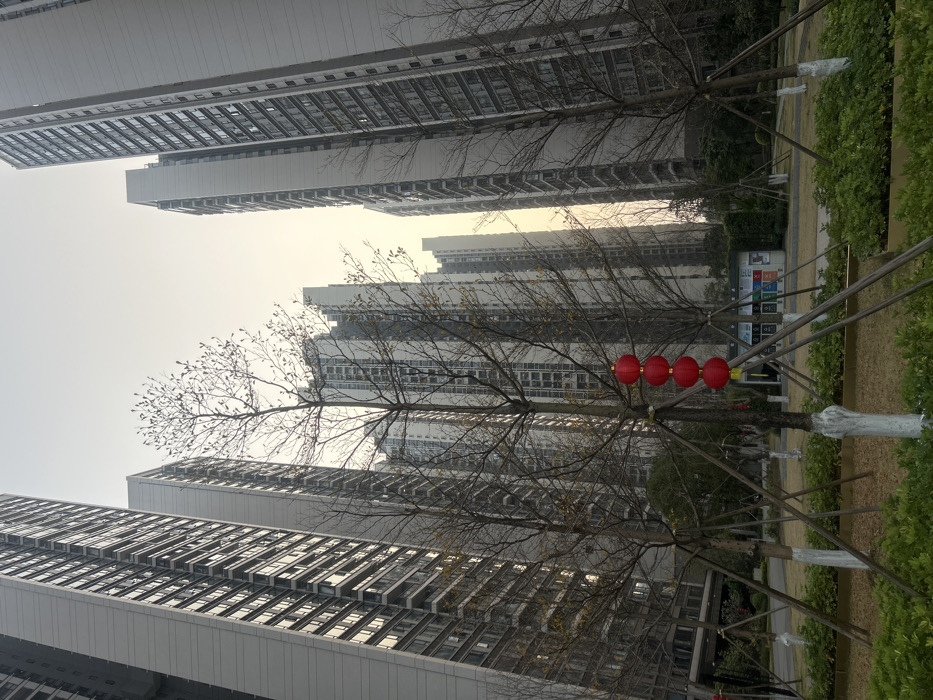 Tall apartment buildings line the background under a hazy sky. A bare tree stands in the foreground with three red lanterns hanging from its branches. The tree is supported by poles wrapped in white plastic. Green foliage and a small structure with colorful posters sit to the right of the tree.