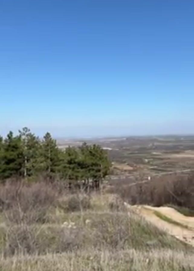 view from a hillside or small mountain overlooking a valley. The sky is clear blue. There are a few pine trees on the left, and some dry grass and brush in the foreground. A dirt road winds down the hill. In the distance, the valley is visible, with fields, patches of trees, and a body of water. The scene is still and peaceful.