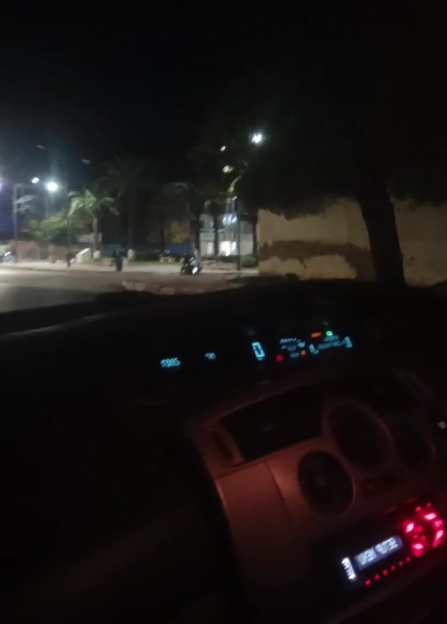 The view from inside a car shows a night scene. The car appears stationary at an intersection, with streetlights illuminating the area. Palm trees are visible across the street. Traffic includes cars and scooters. The car's dashboard is visible, with glowing electronic displays and a car radio. The interior is dark. Loud music is playing.