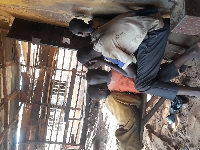 Four boys huddle together on a wooden platform in a makeshift structure. The building is poorly constructed, with exposed beams and tattered roofing. The boys wear casual clothing, with one in a cream-colored shirt and dark pants. The interior is dimly lit, with sand and debris visible on the ground. The scene appears impoverished and intimate.