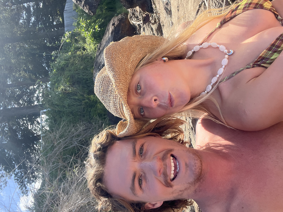 A close-up selfie captured at an unspecified coastal location in Coalcliff, Australia, shows two individuals