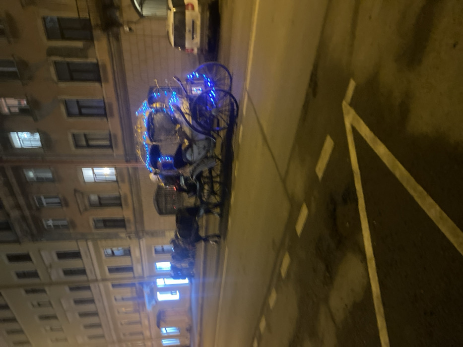 - "A dimly lit city street at night displays an ornate horse-drawn carriage adorned with blue lights, parked along the side of the road" by FM-uS26S2, licensed under CC BY 4.0