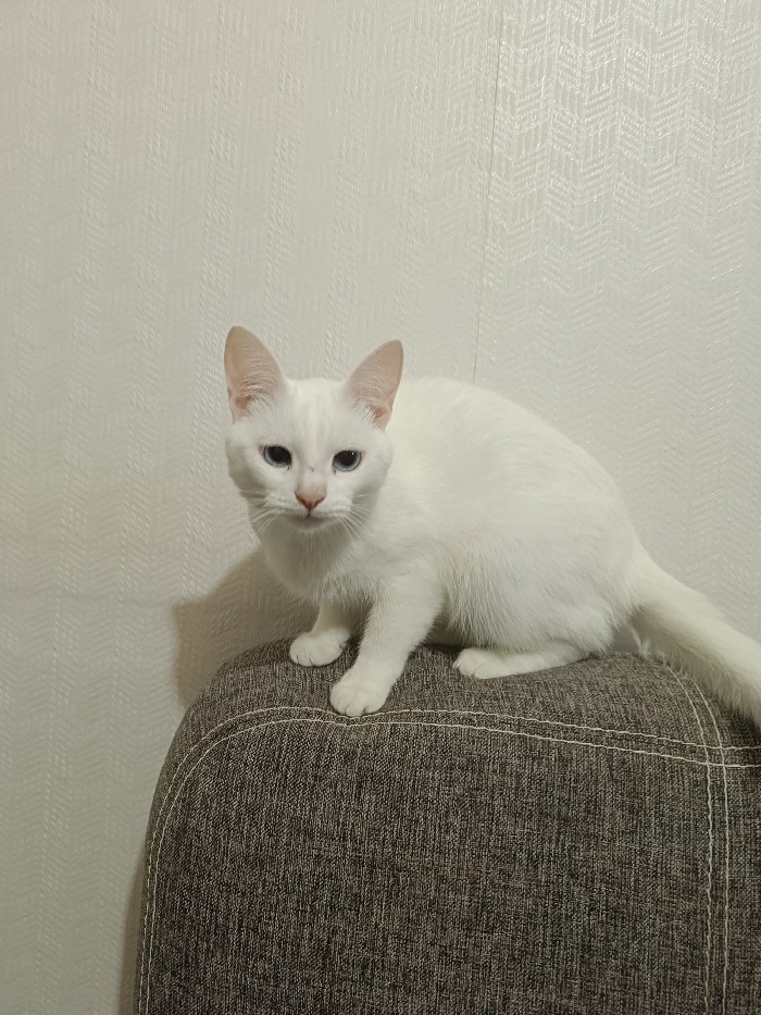 - "A white cat with blue eyes sits on the top of a gray upholstered chair" by FM-w3Qio1, licensed under CC BY 4.0