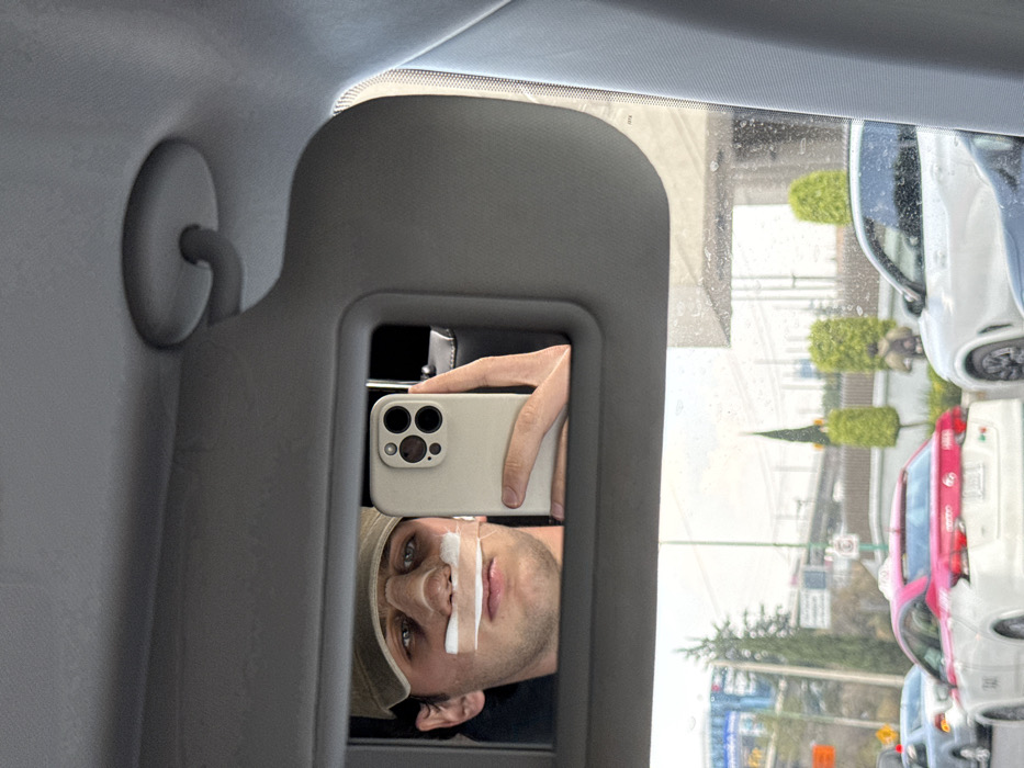 A selfie taken in a car mirror showcases a man with a bandage across his nose
