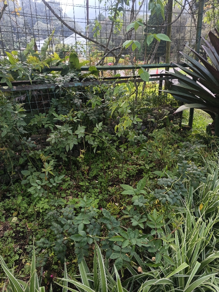 The image displays an overgrown garden area in Kon Tum, Vietnam, observed from a low perspective. The immediate foreground is densely covered with various green plants, including variegated foliage with white and green stripes, and numerous plants consistent with rose bushes. A dark green wire mesh fence, reinforced by thicker horizontal and vertical bars, spans the midground, heavily entangled with climbing vines and leafy vegetation. Behind the fence, additional wild greenery and scattered rocks are visible. In the background, a light-colored building, possibly a greenhouse, is partially discernible through the foliage. A paved path or road is visible horizontally in the distance, upon which a small orange conical object is positioned. Farther back, hazy mountains or hills covered in trees extend across the horizon. No individuals or specific activities are present.