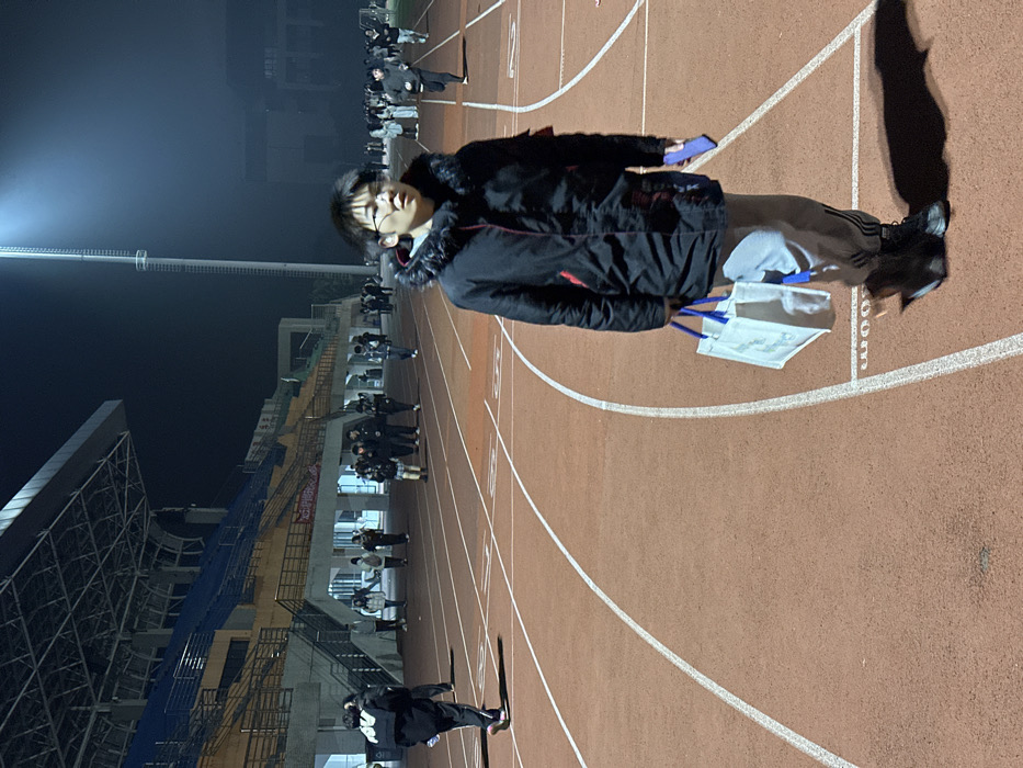The image depicts a nighttime scene at a sports stadium track in Jiangjin, China