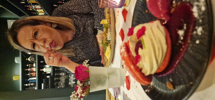 A woman poses playfully near a table set with food. A dessert with red and cream components sits on a dark plate alongside a platter of cheeses and fruit. A vase of roses adds a touch of romance. The setting appears to be a restaurant, suggested by the liquor bottles displayed on a shelf in the background.