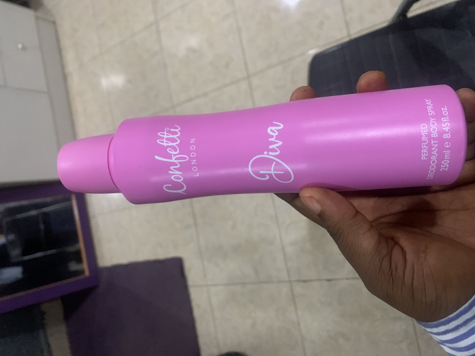 A person is holding a pink can of "Confetti London Diva" perfumed deodorant body spray. The text on the can indicates it contains 250 ml or 8.45 fl. oz. of product. The background features a tiled floor, part of a white cabinet, and a black and purple object that seems to be a box or case.