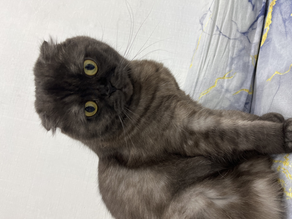 - "A gray Scottish Fold cat with yellow eyes is lying on its back" by FM-gQbQG2, licensed under CC BY 4.0