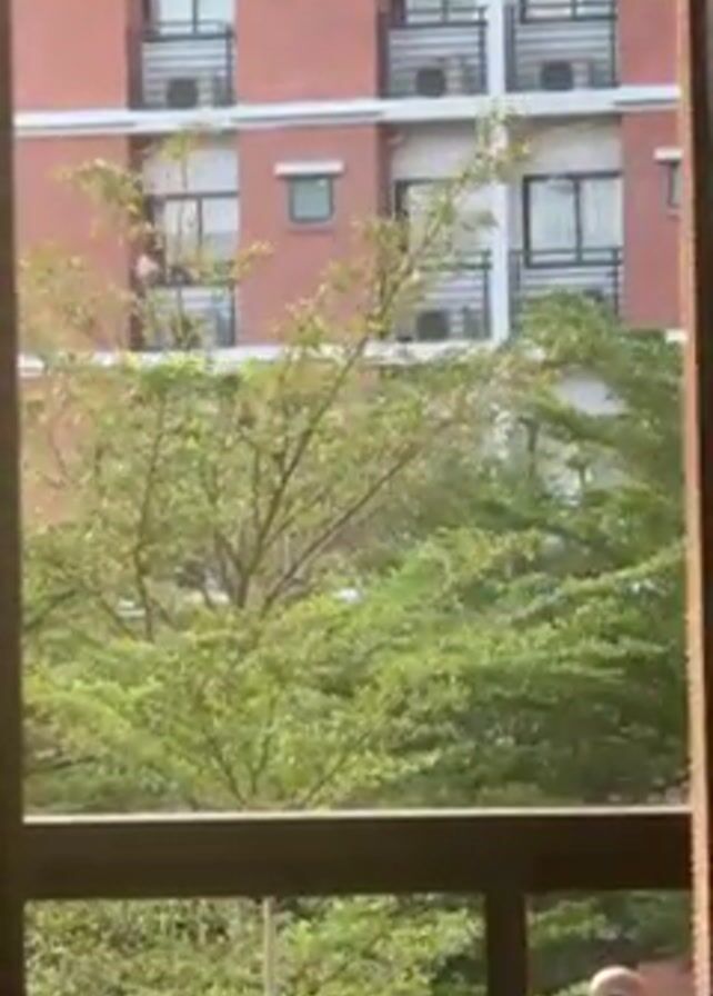The scene is captured from inside a room, looking out through a window. The window frame is visible, suggesting the perspective of someone inside. Outside, there is a dense expanse of green trees. Beyond the trees, a red brick building with multiple windows and balconies stands prominently in the background. A person is briefly visible standing on one of the balconies, moving slightly.