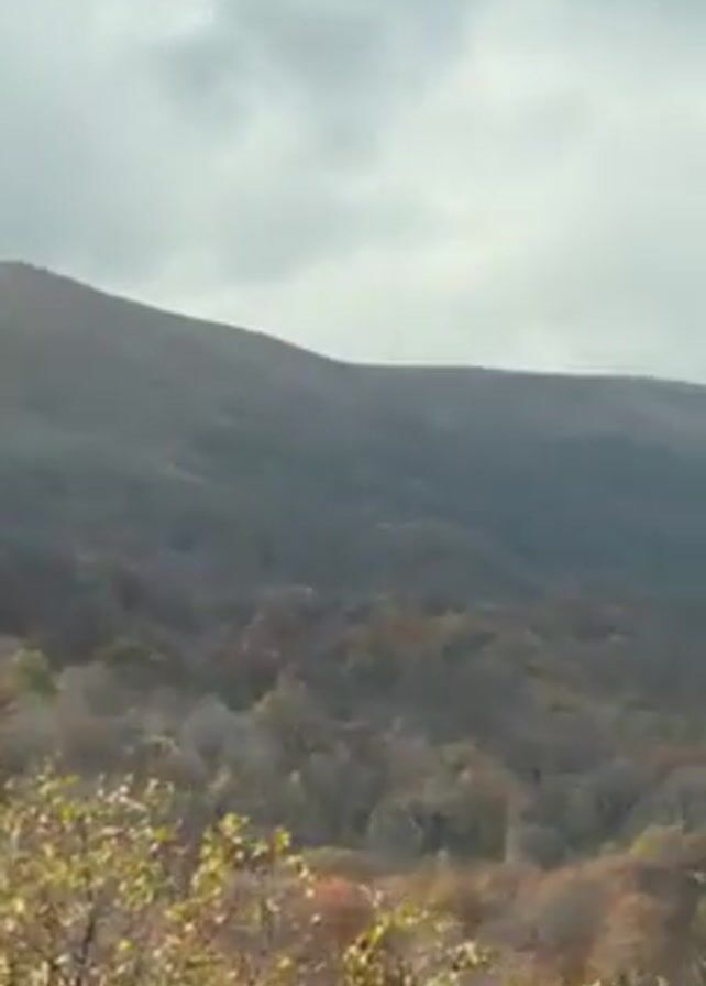 The camera is mounted in a moving vehicle traveling past a forested mountain on a cloudy day