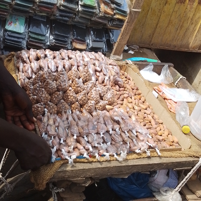An elevated view captures a market stall in Olomoda, Nigeria, displaying various packaged goods. The primary subject is an inclined wooden surface, covered with burlap, laden with brown, nut-like items. A large quantity of these items are loose, forming a heap, while others are individually packaged in small, clear plastic bags tied with white string, arranged in orderly rows. A central pile consists of larger, irregularly shaped items, also clear-bagged. Two dark-skinned hands are visible on the left, positioned as if arranging the merchandise on the stall. To the right of the main display, a small pile of white granular substance is contained within a clear plastic bag, alongside a larger white plastic bag and an empty clear plastic water bottle with a yellow cap. Above these items, a bright blue object rests on a wooden support. The background features a vertical display wall, lined with numerous small, flat, rectangular items, individually sealed in clear plastic, resembling phone cases or wallets, stacked in rows. The stall structure consists of rough wooden planks. Beneath the main display, a blue plastic bag and other indeterminate objects are visible, resting on an uneven surface.