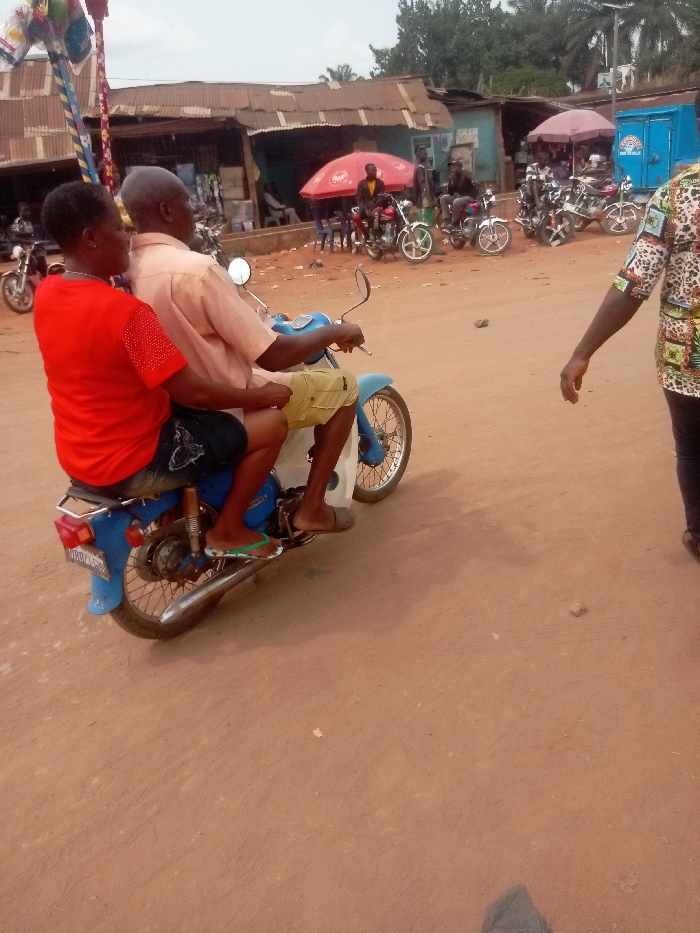 This image captures an outdoor scene in Nnobi, Nigeria, on what appears to be a reddish-brown dirt road or path. In the midground, an adult male operates a light blue motorcycle, carrying an adult female passenger behind him. The male wears a light peach shirt, khaki shorts, and dark flip-flops. The female passenger wears a red shirt with embellished sleeves, dark shorts, and green flip-flops, with her left arm resting on the driver. A tall, colorful decorative pole with streamers is attached to the front of the motorcycle. To the immediate right, a person walks away from the camera, wearing a multi-patterned shirt and dark trousers. The background features a row of single-story commercial structures with corrugated metal roofs. These buildings vary in color, including brown and light blue facades. A prominent red umbrella, possibly branded, provides shade in front of one of the blue buildings, under which several individuals are gathered, some seated. Multiple other motorcycles are parked or staged in the background, with some riders visible. Green foliage and trees are visible beyond the buildings, under an overcast sky. The ground is consistently reddish-brown dirt with scattered small rocks and minimal debris.