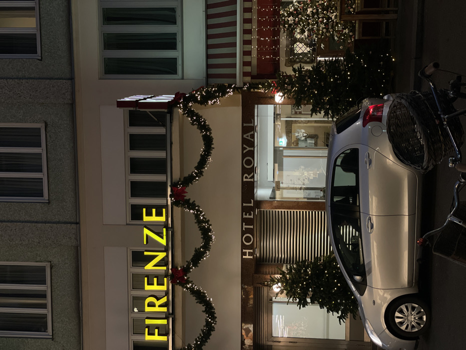 The "Hotel Royal" building is adorned with Christmas decorations. The word "FIRENZE" is displayed in bright yellow letters. Garlands with poinsettias and lights curve between the letters. A silver car is parked in front of the hotel entrance. The entrance has Christmas trees and is topped with red and white striped awnings. A bicycle is also parked next to the car. The building has numerous windows.