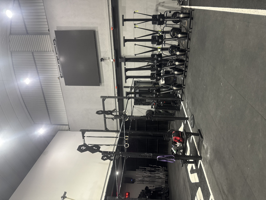 A modern gym features rows of black rowing machines and squat racks against a light gray wall. A large screen is mounted on the wall above the machines. The floor is dark gray with white markings. Exercise equipment, including weights and barbells, is stored neatly beneath the squat racks. Gym rings hang from the racks. The lighting is bright, illuminating the spacious interior.