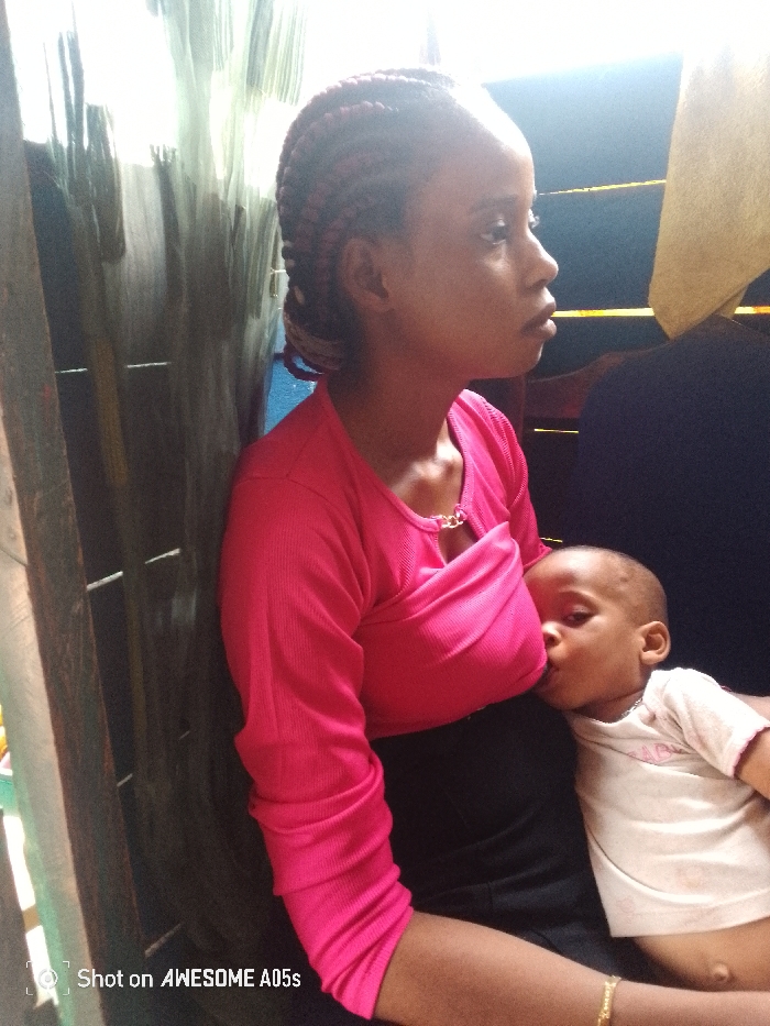 A medium shot depicts an adult female breastfeeding a young child within an enclosed or semi-enclosed space