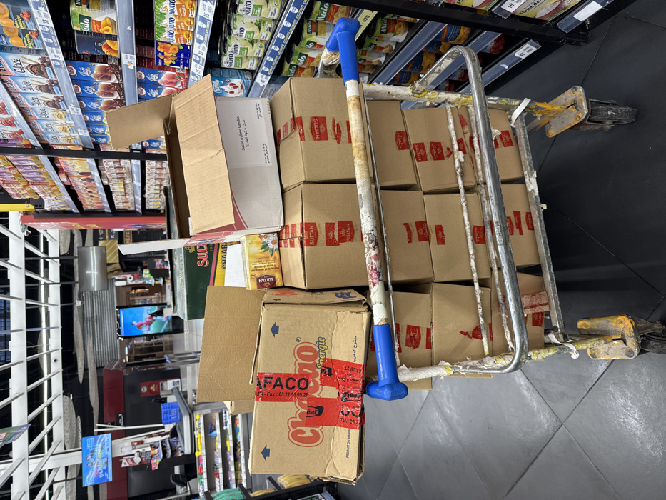 A gray metal trolley filled with cardboard boxes stands in a supermarket aisle. Most of the boxes are labeled "Sultan" with a red stripe. At the bottom, a "Chocao Energie" box secured with red tape is visible. An open cardboard box sits atop the pile. The supermarket shelves behind display various products, including juice boxes and chocolate bars. A support beam and a TV screen are visible further down the aisle. The floor is tiled gray and black.