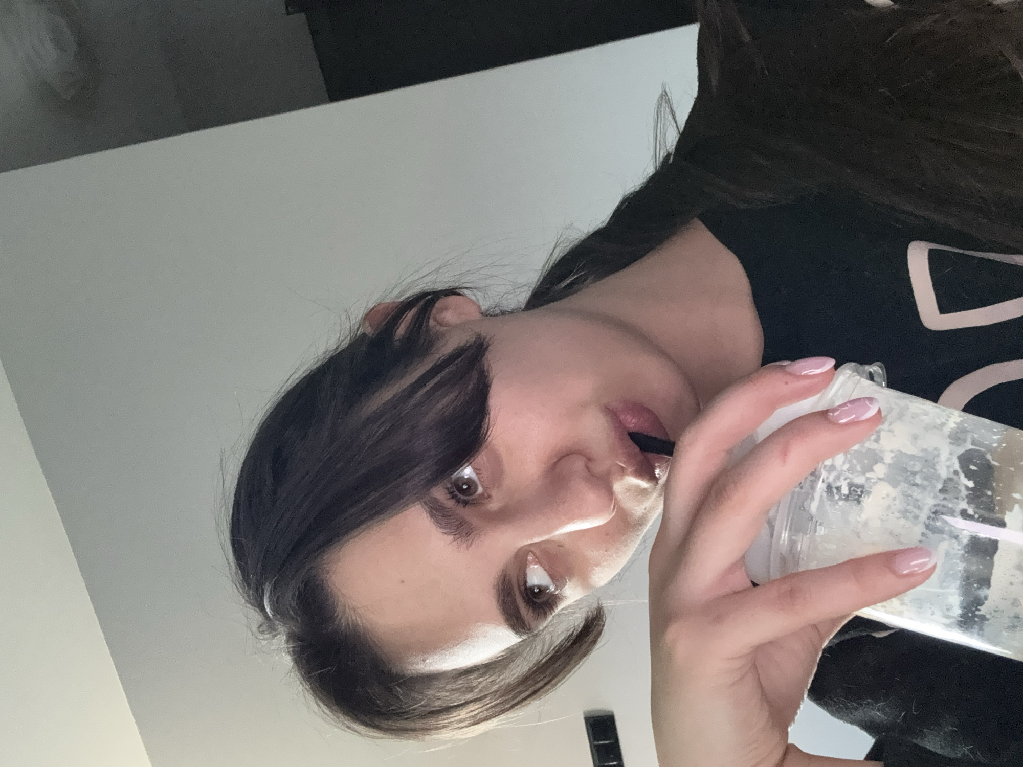 An image taken in Bozhurishte, Bulgaria, depicts a female individual, approximately young adult, positioned in a close-up, angled shot. The subject has dark brown hair, styled with bangs across the forehead and pulled back into a ponytail visible on the right. Her skin tone is fair. Her dark brown eyes are directed upwards and to the right, and her eyebrows are prominent. Her lips are partially closed around a black plastic straw. She is wearing a dark-colored garment, likely a shirt, with a light-colored design partially visible on the lower right. Her left hand, with nails manicured in a light pink base with white tips, holds a clear plastic cup. The cup contains a light-colored, frothy liquid, with residue adhering to the interior walls. In the background, a plain, light-colored wall is visible, with a dark rectangular electrical outlet or switch mounted on the left side. A darker vertical area or shadow is present on the far right background, suggesting a corner or architectural feature. The scene is indoors with ambient lighting.