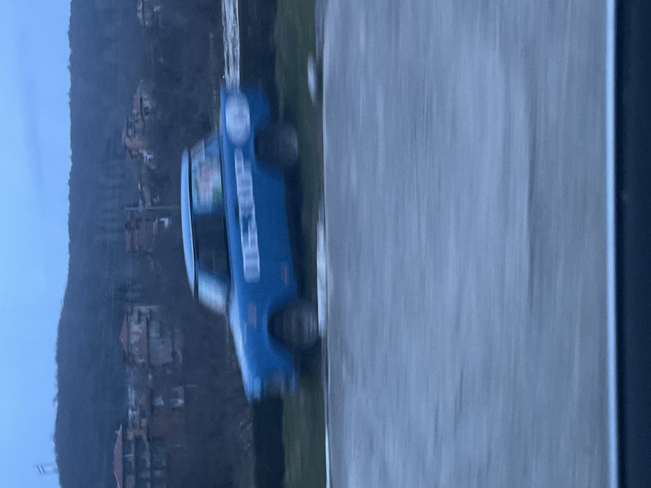 This image captures an outdoor scene in the city of Obzor, Bulgaria, characterized by soft, overcast lighting. A blue two-door sedan, appearing to be an older model, is the central subject, exhibiting significant horizontal motion blur that suggests movement from left to right. The vehicle's side panel clearly displays white text, "ОБЗОР" (Obzor), and blurred graphics are present on its rear window. The car is situated on a strip of green grass, behind which a dark barrier or fence is visible. In the background, a steep, forested hillside rises, dotted with multiple residential buildings featuring reddish-brown roofs. The sky above is a muted blue-grey. The immediate foreground shows a heavily motion-blurred grey surface, likely a paved area or road, separated from the grass by a white line. No individuals are discernible in the frame.