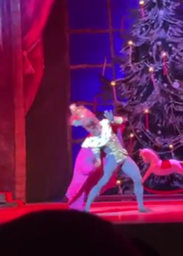 ballet performance on a stage, possibly of "The Nutcracker". The main character visible is a performer dressed as a rat king, in a blue bodysuit with gold accents and a pink cape, doing ballet moves. The background includes a large Christmas tree decorated with lights, a window pane, and a pink rocking horse. The lighting is primarily red and blue, with red curtains visible on the left side of the stage. The camera is mostly static, with slight movement likely due to handheld recording. People are visible in the foreground audience.