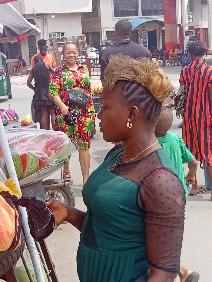 The image depicts a bustling street scene in a commercial area of Ura Nta Umuarandu, Nigeria, under bright daylight. In the immediate foreground, a dark-skinned woman is shown in profile, facing right, wearing a dark green dress with a pleated skirt section and sheer, dark, polka-dotted mesh sleeves and upper chest panel, revealing a dark red undergarment on her left shoulder. She has a distinctive hairstyle featuring braided cornrows on the sides leading to a voluminous, spiky, light brown/blonde mohawk-style top. She wears gold-colored hoop earrings and a thin gold-colored chain with a heart-shaped pendant. Her right hand holds a black plastic bag. To her left, a fruit vendor's metal cart with wheels displays sliced watermelon wrapped in clear plastic and possibly other fruits like pineapple. A young child in a green shirt is partially visible next to the woman in the foreground. In the midground, a smiling dark-skinned woman in a short-sleeved, brightly patterned dress with red, green, and white leaf motifs looks directly at the camera. She carries a black fanny pack or crossbody bag and holds a black object in her left hand. Behind her, a dark-skinned man with closely cropped hair, wearing a black shirt, is seen from behind, facing away. Further left, a man in an orange t-shirt and a woman in a black dress are partially visible. A green motorized tricycle taxi (Keke Napep) is partially visible on the far left. The background features several multi-story buildings with light-colored facades, some with windows and awnings. One building displays architectural elements resembling columns. Numerous other individuals are scattered throughout the scene, some seated, others walking, indicating a crowded public thoroughfare. The ground surface is paved.