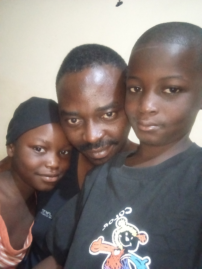 A man and two children pose closely together. The man has dark hair and a mustache. One child wears a black head covering. The other child has a short haircut. All three have dark skin tones. The child in the front wears a black t-shirt with a cartoon design. They stand in front of a plain, light-colored wall. The lighting is somewhat dim.