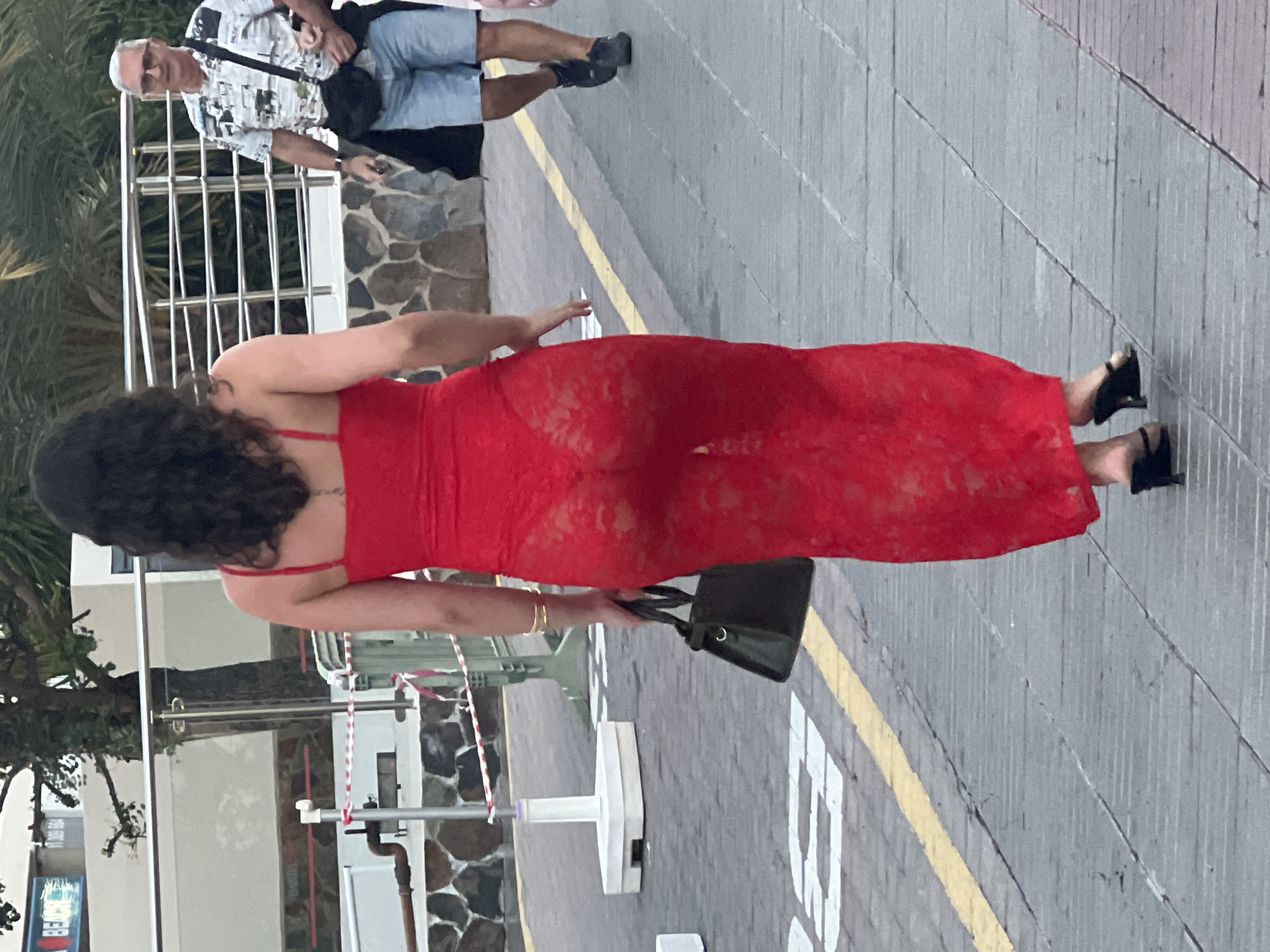 A woman wearing a long, red, semi-transparent lace dress is walking on a tiled sidewalk in San Bartolomé de Tirajana, Spain