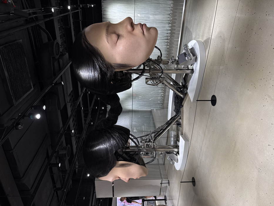 A large-scale kinetic sculpture featuring two hyper-realistic, identical female robotic heads is centrally displayed within a modern commercial or gallery space identified as the Nike House of Innovation 001 in Shanghai, China. Each head, with closed eyes, smooth skin, and dark, highly reflective hair, faces outwards, creating a symmetrical presentation. Their slicked-back hair is intertwined into a single, thick, dark braid that arches between them, connecting the two heads. Each head is mounted on complex, exposed polished chrome or stainless steel robotic armatures, revealing hydraulic lines, wires, and internal mechanisms. These armatures are anchored to two distinct, curved white bases positioned on a light grey, speckled concrete floor. A low barrier, consisting of two black stanchions connected by a thin black cord, defines the immediate viewing area around the sculpture. In the background to the far left, a partially visible individual stands, wearing a dark t-shirt and light shorts, near a white, vertically fluted wall segment. The right background features a transparent glass barrier behind which a light grey, textured wall, resembling vertical slats or drapes, is visible. The overhead ceiling is dark grey or black, exposing ducts, pipes, numerous track lighting fixtures, and a security camera. The space is uniformly illuminated by overhead artificial light.