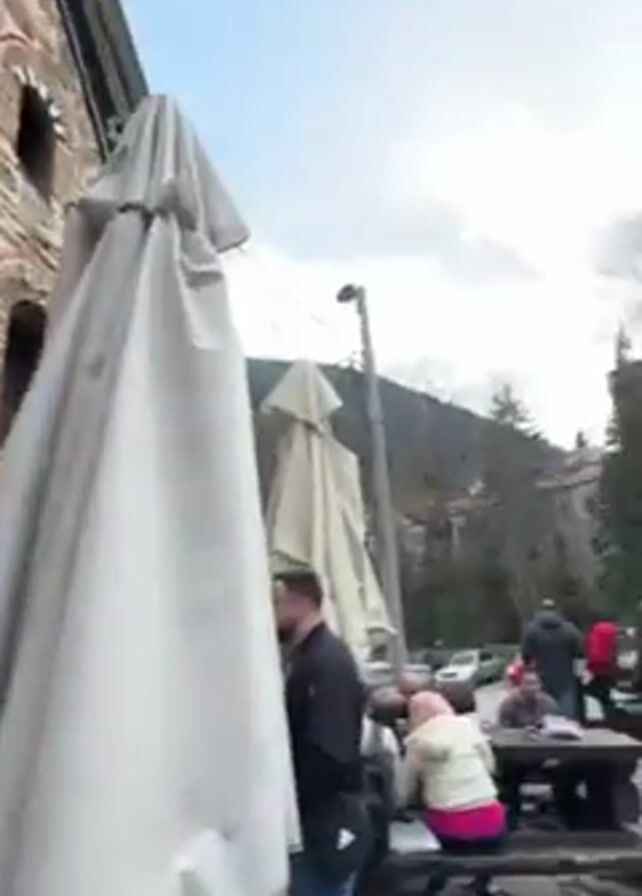 n exterior view of what appears to be a stone building, possibly a restaurant or entrance to a monastery, with people entering. The structure features stone walls with a horizontal red brick pattern. Adjacent to the entrance, there are informational posters. A group of individuals is walking in front of the building. A wider shot reveals an outdoor dining area with people seated at tables under umbrellas, indicating a public space, possibly a courtyard or plaza. The sky is partly cloudy, and there are trees in the background, suggesting a natural or mountainous environment. People are moving about the area, eating and chatting.