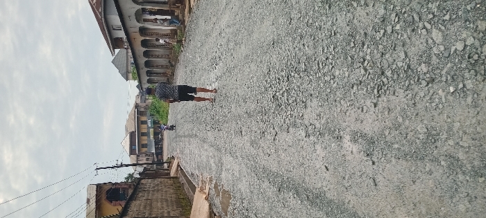 A man in a checkered shirt stands on a rocky, unpaved road. Buildings line either side of the street. One building features arched doorways. A motorbike is parked on the road further down. Utility poles and lines are visible on the left. The sky is overcast.
