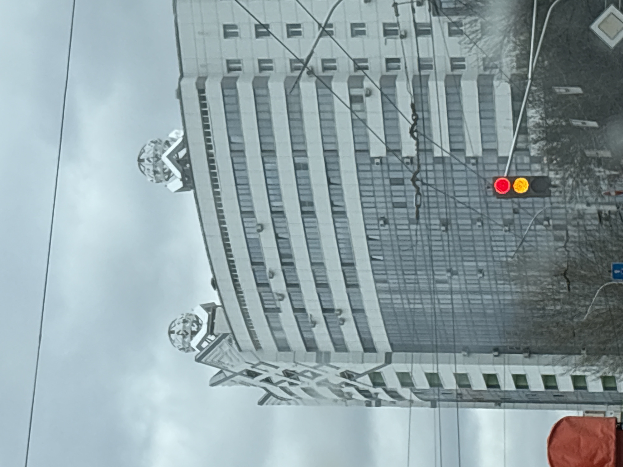 tall, white building in Ufa, Russia. The building has a distinctive architectural style with repetitive vertical columns of windows. Atop the building, there are decorative globe-like structures on the corners. A traffic light displaying a red and yellow signal is visible to the right of the building. Power lines and utility poles are in the foreground, obscuring some of the details of the building. The sky is overcast. A road and some trees are visible adjacent to the building. Part of a road sign is also visible in the frame. A red object, likely a part of a vehicle, is visible in the lower right corner.