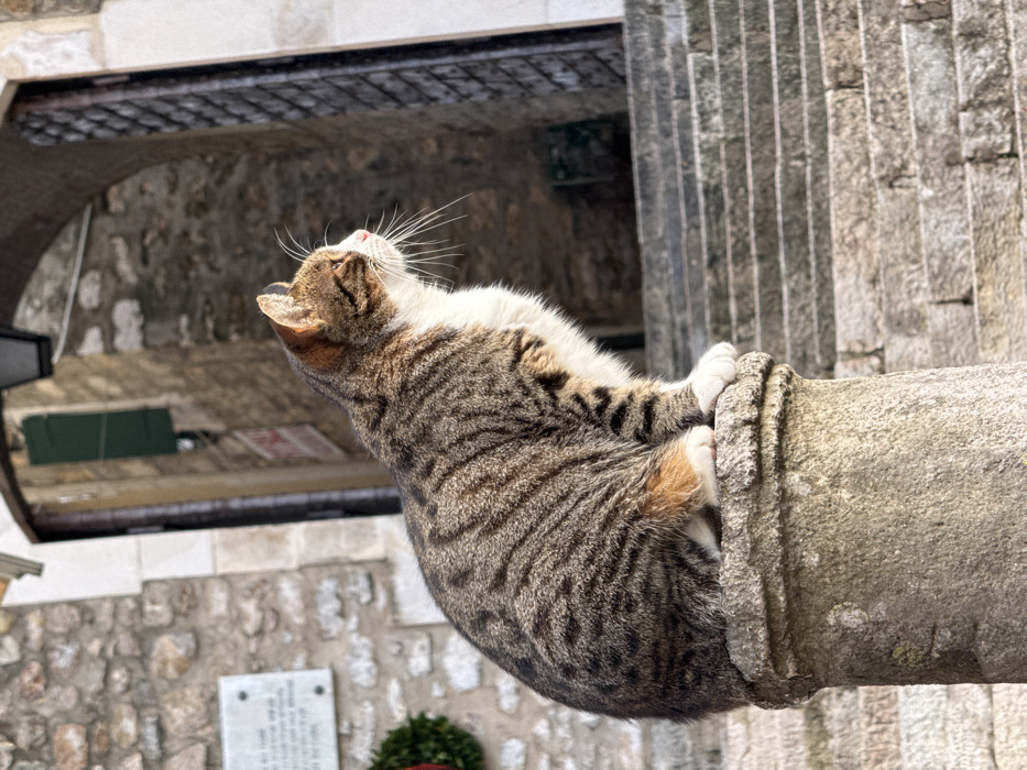 An adult domestic cat, exhibiting a tabby pattern with brown and black stripes, a white chest and paws, and traces of ginger fur on its hind legs, is seated facing right atop a weathered cylindrical stone pillar. Its gaze is directed towards the right side of the frame, with prominent white whiskers visible. The scene is set in an urban outdoor environment, specifically in Herceg Novi, Montenegro. In the background, architectural elements constructed from grey stone are visible. To the left of the cat, a stone wall features a white rectangular plaque with text and a partially visible red and green wreath. To the right and behind the cat, a series of stone steps ascends. Further back, a dark, arched stone passageway is present, possibly secured by a gate or grating. Above this archway, a black, traditional street lamp is affixed. Beyond the arch, another stone building with a green shutter on a window is discernible. A red sign is partially visible to the left of the archway. The environment is illuminated by strong, natural light, casting shadows. No other individuals are present.