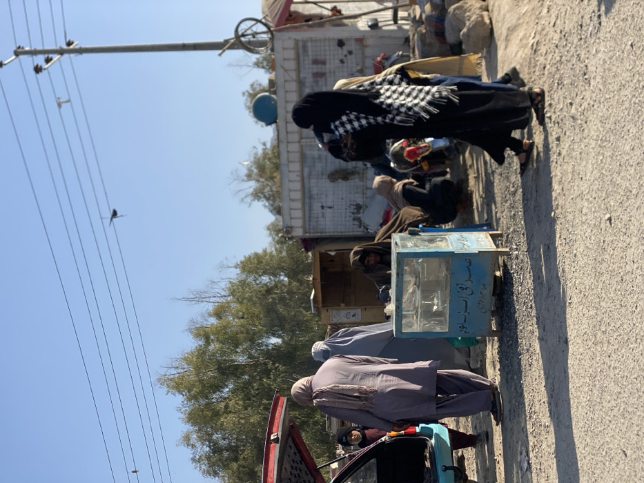 This image captures an outdoor street scene in کوکران, Afghanistan, under clear blue skies