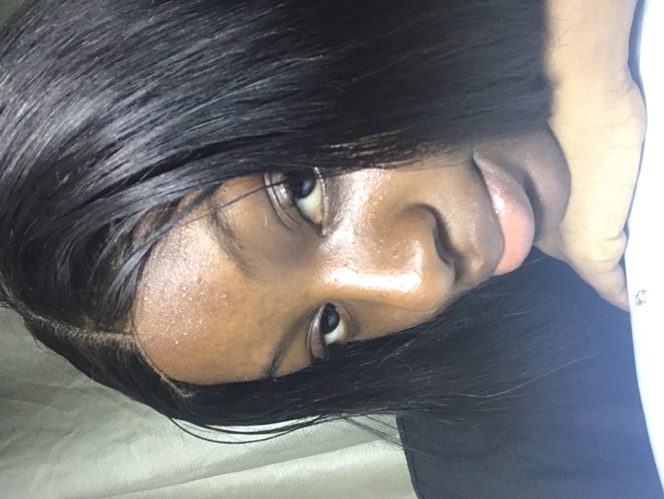 A person with dark hair framing their face is close to the camera. The individual has brown skin, dark eyes, and full lips. Their hair is styled straight and sleek. The image is taken from a slightly skewed angle, with the face tilted towards the camera. The lighting highlights the sheen of their skin and hair. Part of the person's hand is visible in the image.