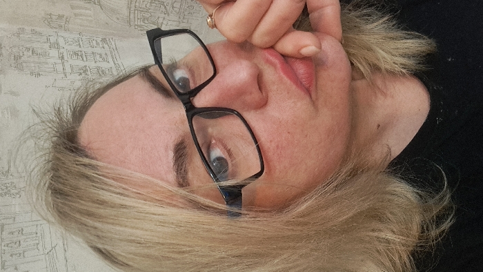This is a close-up, indoor portrait of an adult female in the city of Меткомелино, Russia. The subject, viewed from the chest up, has blonde, slightly disheveled hair with visible darker roots at the crown. She wears black-framed eyeglasses with clear lenses and a blue accent on the temples. Her eyes, appearing wide, are directed slightly upward and to the viewer's left. Her lips are pursed in a pout, and her left hand, adorned with a ring on the ring finger, lightly supports her chin and lower lip. She is wearing a black garment, possibly a t-shirt, visible around her neck and shoulders, on which several small white specks are present. The background is a light-colored wall featuring faint, repeating sketches of urban architectural structures.