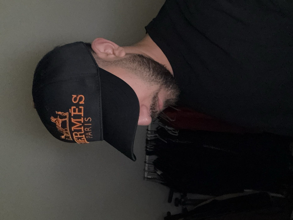A man wearing a black t-shirt and a black baseball cap with the Hermes logo in orange is partially shown. The side of his face is visible, revealing a beard, ear, and a glimpse of his nose. The background appears to be a dark, cluttered space, possibly a closet, with hanging clothes. The image is slightly rotated to the side.