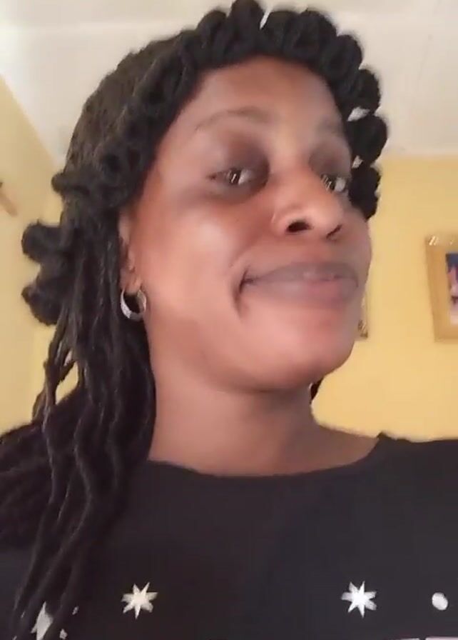 A woman is looking at the camera. She has dreadlocks styled into looped sections around her face. She is wearing a black shirt with white stars and a red inscription which is backwards. She is wearing silver hoop earrings. She has dark skin. Behind her is a yellow wall with a framed picture. The ceiling is white. Music is playing in the background.