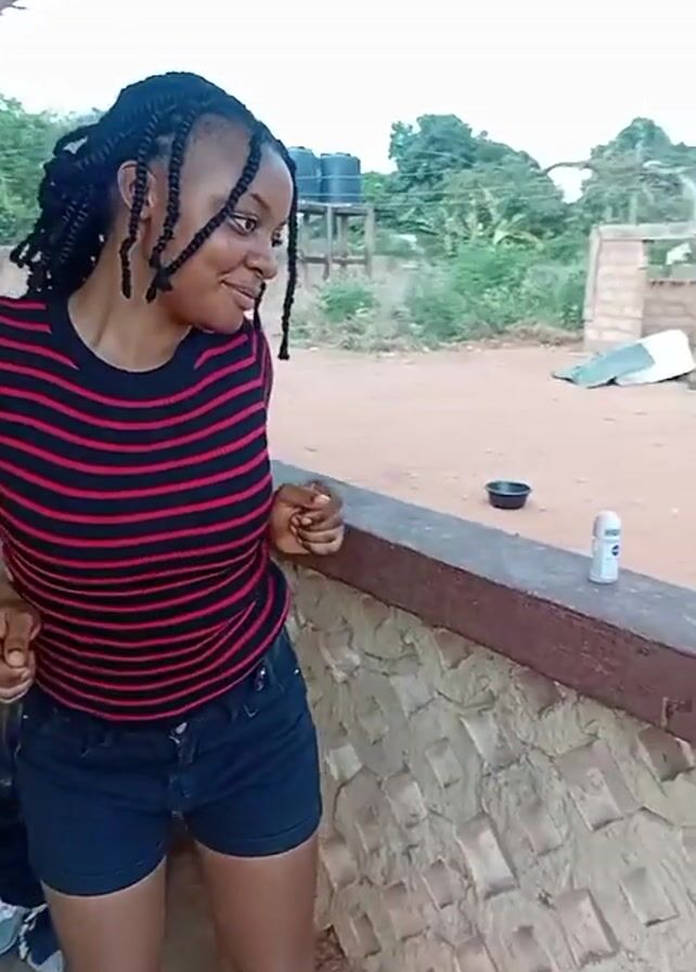 A woman with braided hair dances to music on a porch in front of a rural background. She is wearing a red and black striped t-shirt and denim shorts. A can of deodorant and a pair of shoes sit on the porch wall beside her. The area behind the porch has a dirt ground, some vegetation, and small buildings.