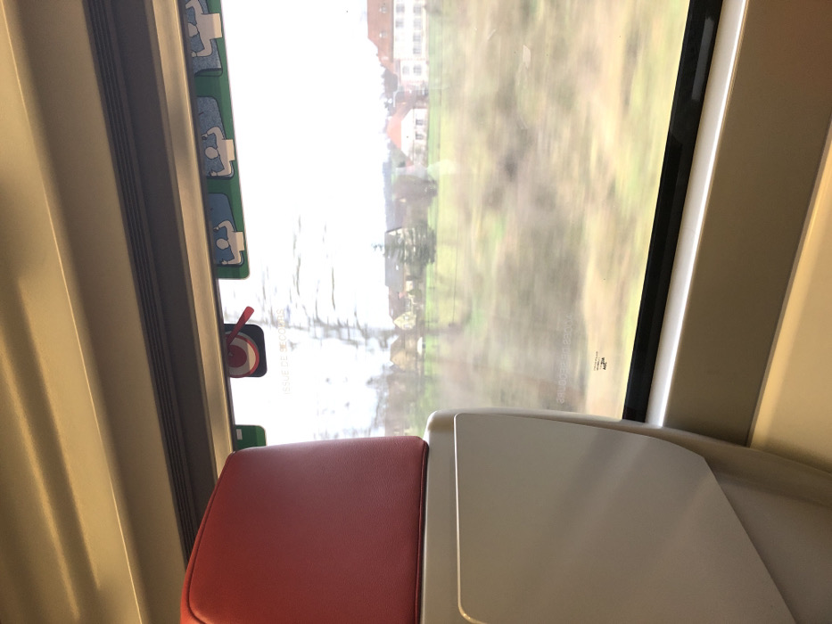 The image depicts a view from the interior of a train in motion, looking out through a window onto the landscape of Hochfelden, France