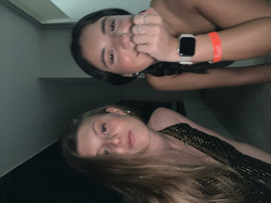 Two young women pose closely, facing the camera. The first woman, with dark hair in a braid, rests her hand against her face, displaying rings and a watch on her wrist, along with a red wristband. The second woman, sporting blonde hair and hoop earrings, wears a shimmering black and gold top. The image is taken at an unusual angle, giving a slightly skewed perspective. A dimly lit corridor is visible in the background.