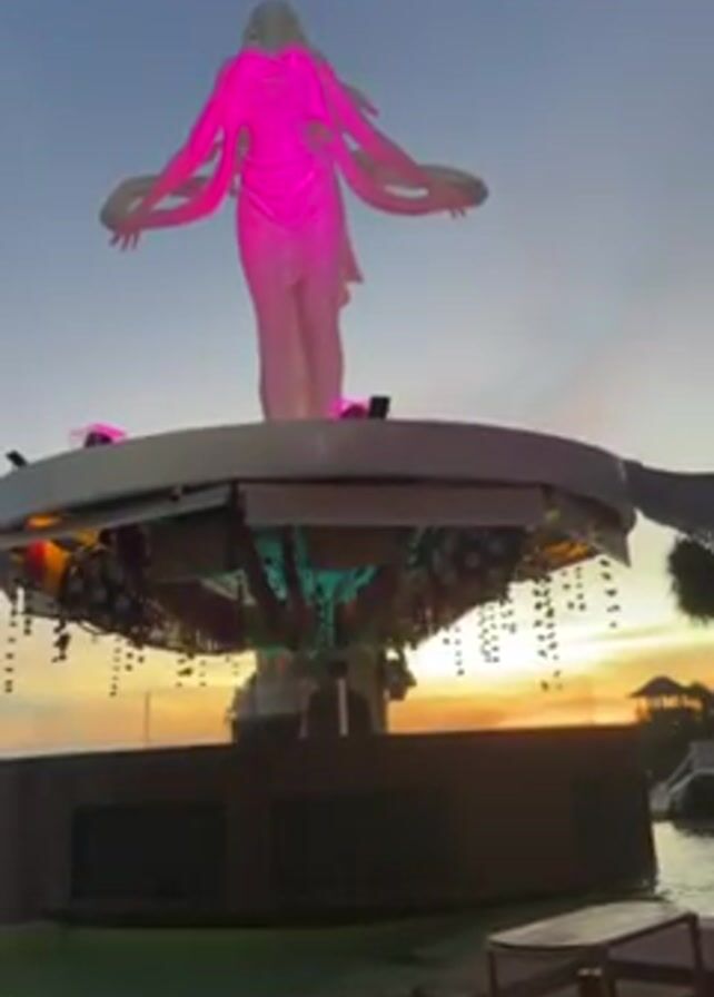 sculpture of a woman illuminated in pink, standing on a platform above a pool. The platform is white and round, with lights underneath. The pool has light green water. In the background, a sunset is visible with shades of orange and yellow. A thatched roof decoration hangs above the sculpture. There are lounge chairs and other structures near the pool. The sculpture is the focal point, contrasting against the backdrop of the sunset.