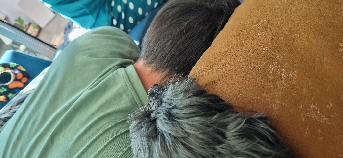 A person wearing a green shirt is reclining against a brown pillow. The back of their head is visible, revealing short, dark hair. Partially visible is a dog's head, pressed close to the person's neck. The dog has shaggy, grey fur and a slightly darker snout. To the side, a blue and white patterned object is visible. The scene suggests a comfortable, relaxed moment shared between a person and their pet.