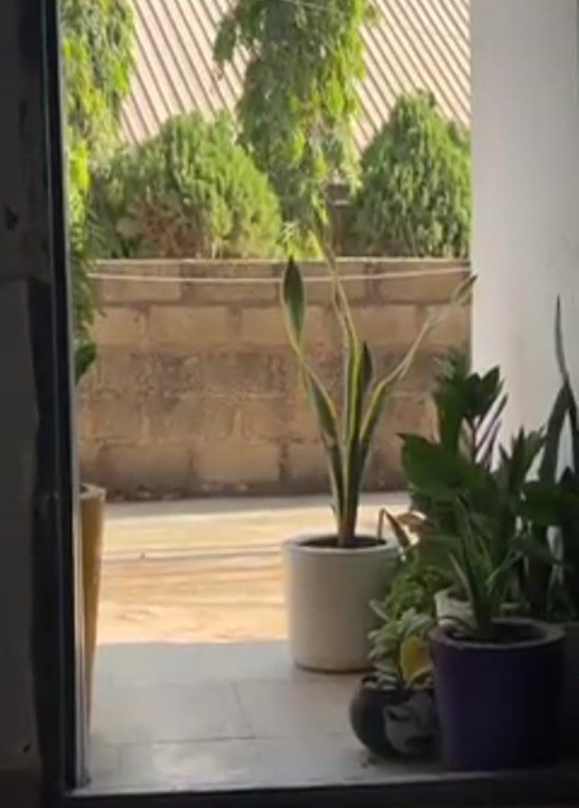 From an indoor perspective through an open doorway, a view of an outdoor patio and garden is presented. The doorway is partially obscured by the doorframe. A variety of potted plants in containers of different colors like white and purple are positioned on the tiled patio directly outside the doorway. Beyond the patio, a low brick wall borders the garden. Trees with green foliage rise above the wall. In the background, a building with a light-colored gabled roof is visible. The lighting suggests it is daytime with bright sunlight.