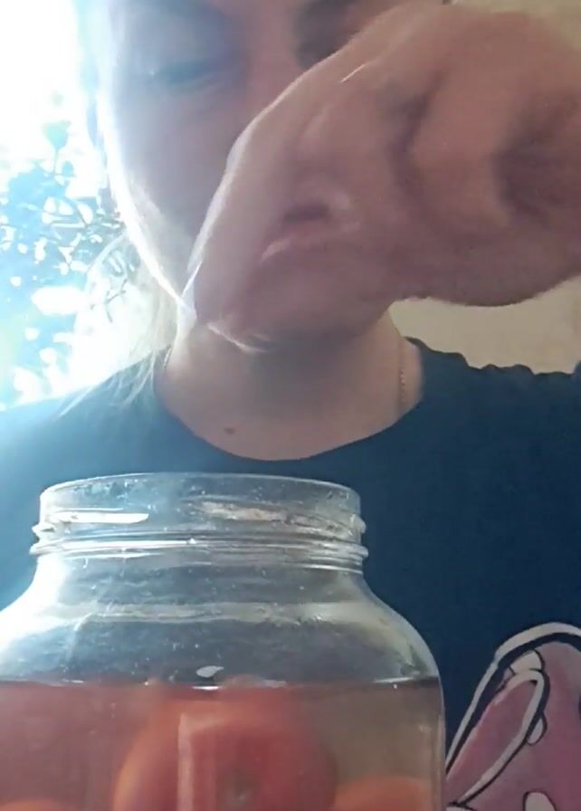 A fair-skinned woman with light brown hair, wearing a dark blue t-shirt with a cartoon print, is the central figure in the video. She is standing indoors, holding a glass jar filled with a reddish liquid and some red objects that appear to be pickled tomatoes. The woman opens the jar and removes a tomato. She brings the tomato to her mouth, closing her eyes and pursing her lips around it as if giving it a kiss. The background includes a wall with a light-colored pattern. Bright light is visible behind her, possibly coming from a window. The focus is on her face and the jar.